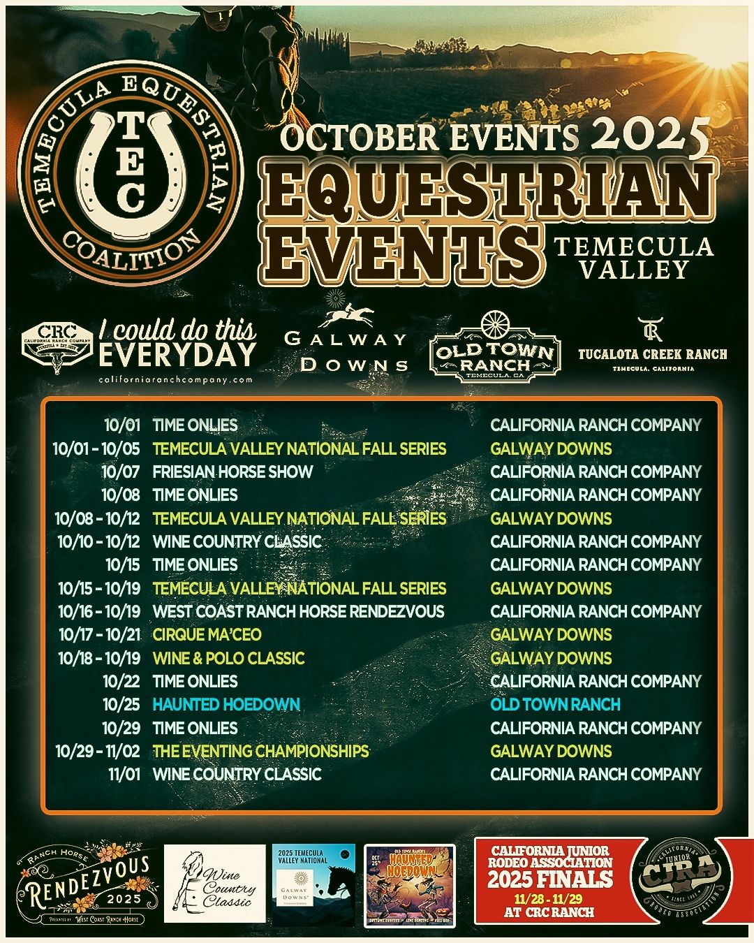 California Ranch Company is one of Southern California's Premiere, Private Horse Training, Competition and Event Venue Facilities. Offering Wine Country Horseback Rides, The CRC Ranch is located in Riverside County just outside the City of Temecula which was established in 1859 and is known as "The Heart of The Southern California Wine Country."
