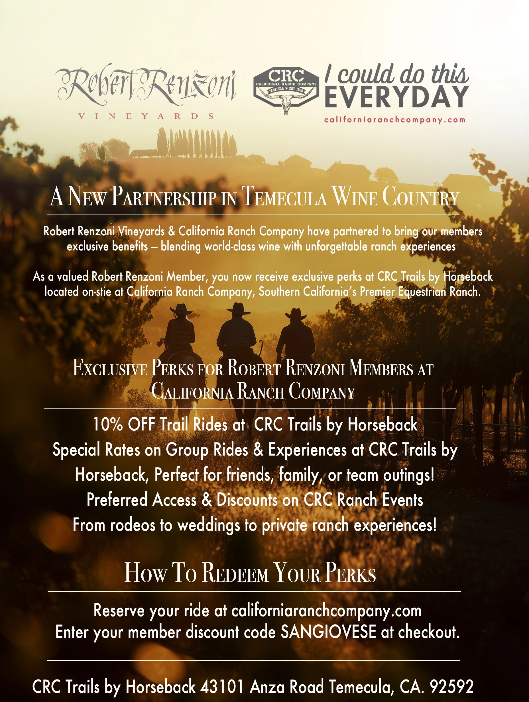 Robert Renzoni Vineyards & California Ranch Company have partnered to bring members exclusive benefits - blending World Class Wine with unique and unforgettable ranch experiences.